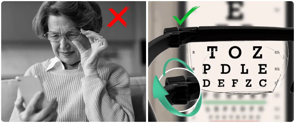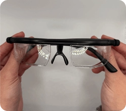 Turn the dial right for closer focus (reading, crafts, checking medication labels), or left for distance (driving, TV, golf). Each eye adjusts separately because, let's face it, our eyes rarely age at the same rate.